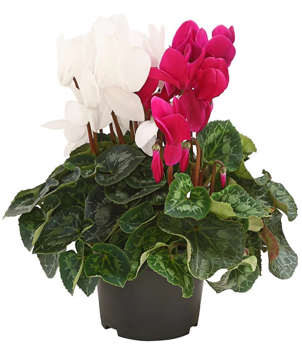 Eigentlich ist der Name Alpenveilchen irreführend. Denn die wilden Verwandten unserer Zimmerpflanzen wachsen nicht in den Alpen. In den Gebirgsregionen Griechenlands und der Türkei sieht man sie eher an kühlen und teilweise schattigen Standorten wachsen und ähnliche Plätze bevorzugen die Cyclamen auch in der Wohnung. Absonnig, hell und kühl soll es sein, das Thermometer soll die 20°C nicht übersteigen. Wenn Sie der Zimmerpflanze diesen Wunsch erfüllen, wird sie sich den ganzen Winter über mit immer neuen, hübschen Blüten bei Ihnen bedanken. Alpenveilchen gehören zu den Knollenpflanzen, was bedeutet, dass der oberirdische Teil der Knolle beim Gießen nicht nass werden darf. Gießen Sie die Pflanze deshalb immer von unten, also am besten über den Untersetzer. Entfernen Sie auch das überschüssige Gießwasser nach einiger Zeit, um Wurzelfäulnis zu vermeiden. Zusätzlich ist eine zweiwöchige Zugabe von Dünger empfehlenswert. Wenn Sie die Pflanze im Herbst umtopfen, achten Sie darauf, dass die Knolle etwas aus dem Substrat herausschaut. Entfernen Sie verwelkte Blätter und Verblühtes durch vorsichtiges Abdrehen von der Pflanze. Im Sommer mag die Cyclame auch gerne draußen stehen, am liebsten an einem halbschattigen Platz.