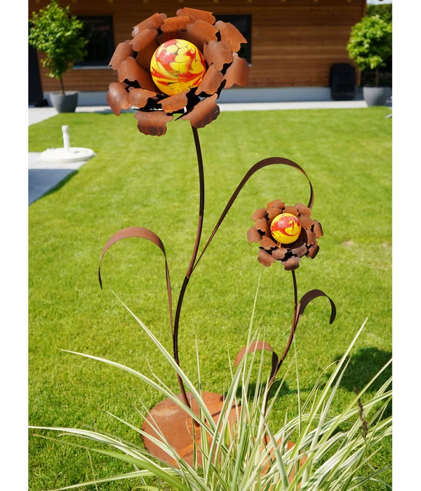 Sind Sie ein großer Freund von ins Auge springenden Zierobjekten, mit denen Sie Ihr Haus oder den Außenbereich optisch verschönern? Dann kommen Sie an der Badeko Metall-Blume Bavaria nicht vorbei. Diese überzeugend gestaltete Metallblume mit der dekorativen Glaskugel als Blütenmittelpunkt ist ein ästhetischer Eyecatcher der besonderen Art. Unterstützt wird der zauberhafte Eindruck, den das Dekoprodukt vermittelt, durch den stilvollen Edelrost. Das macht die aus frostbeständigem Stahlblech gefertigte Blume zu einer Ikone der Blechkunst. Mit ihrem Charme zeigt sich die Metall-Blume Bavaria aus dem Hause Badeko als optimale Dekoration.
