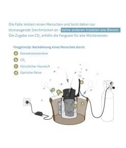 Der Mechanismus der Biogents BG-Mosquitaire CO2 Mückenfalle ist so einfach wie sicher. Dabei ahmt der beiliegende Duftbeutel mit dem BG-Sweetscent Lockstoff die Hautgerüche des menschlichen Körpers nach. Hinzu kommen gezielt eingesetzte Schwarz-Weiß-Kontraste, die für Mücken die visuellen Reize eines Menschen simulieren. Zu guter Letzt wirkt das CO2 als Bestandteil des menschlichen Atems zusätzlich unwiderstehlich anziehend. Das Gerät besitzt ein CO2-Set, Sie müssen nur noch die passende CO2-Flasche besorgen und anschließen.