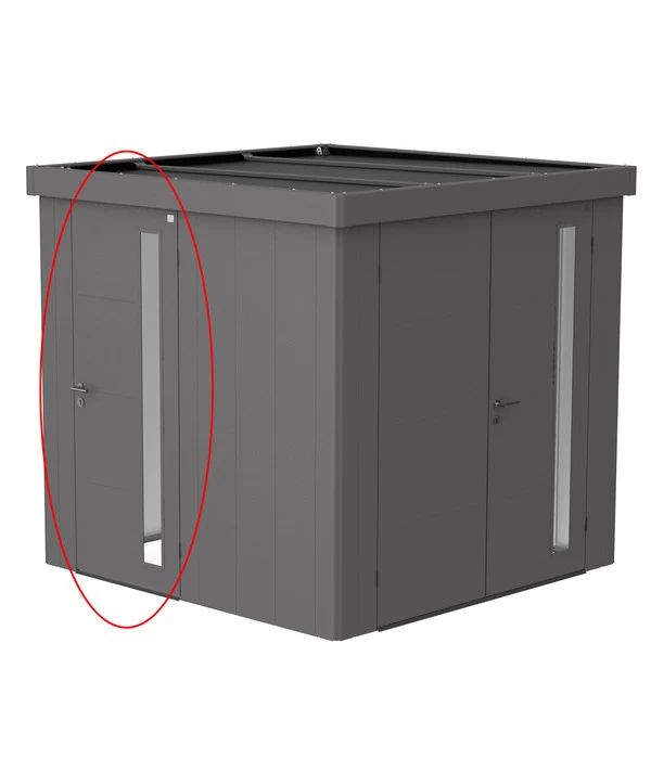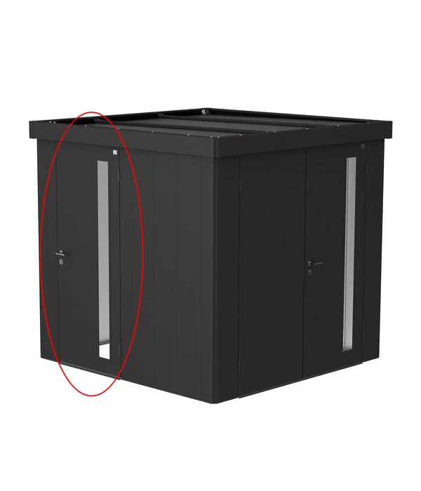 Haben Sie auch manchmal das Problem, dass Sie gerne etwas aus Ihrer Gartenhütte rausholen oder reinbringen möchten, aber es ist zu wenig Platz? Dann kann die Biohort Gerätehaus Neo Zusatztür Abhilfe leisten. Sie befindet sich nicht auf der gleichen Seite wie die bereits vorhandene Tür, wodurch es um einiges einfacher ist größere Gerätschaften in das Gartenhaus hineinzubringen und herauszuholen. Denn so kann eine zweite Person das Gerät von der Seite annehmen, ohne, dass Sie sich vorher in die Hütte rein quetschen mussten. Die Türanschlagbleche, die Schaniere und die Gasdruckfeder sind selbstverständlich mit enthalten. Dank Normzylinder und komfortabler Edelstahl-Drückgarnitur ist das Öffnen und Schließen der Tür kinderleicht.