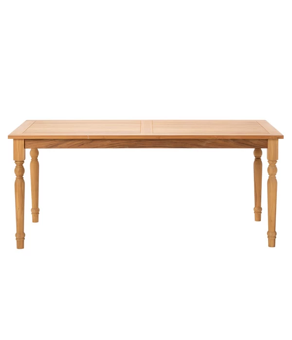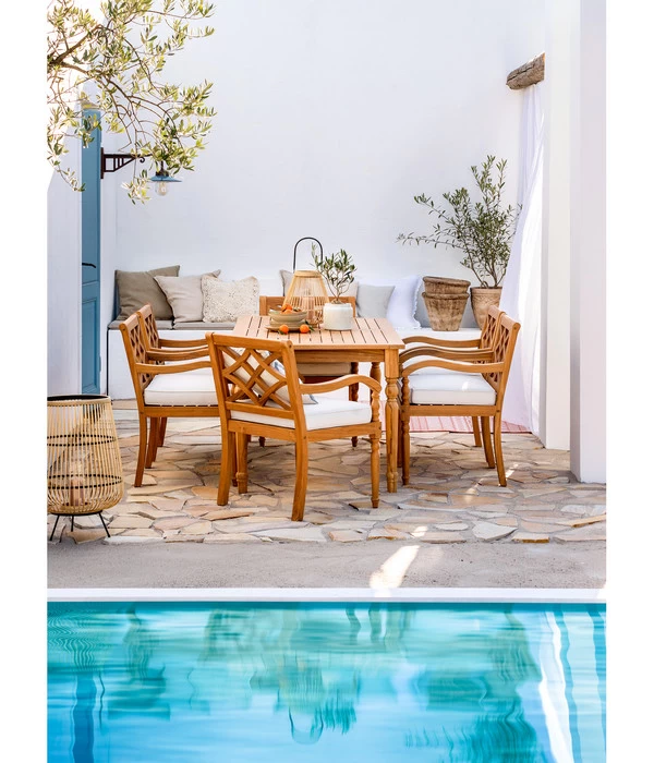 Die ersten Vorbereitungen für Ihr Sommerwohnzimmer unter freiem Himmel sind fertig: Sie besitzen einen Outdoorteppich, haben sich mit den schönsten Kübelpflanzen umgeben und Ihr Sonnenschirm ist der perfekte Schattenspender. Deshalb geht es jetzt an das Wichtigste: die Möblierung. Am besten beginnen Sie mit dem Dehner Diningtisch Savona, denn dieser elegante Outdoortisch lässt keine Wünsche offen. Sei es in puncto Qualität, wie auch in puncto Ausstrahlung, Design und Komfort. Das exklusive Modell wurde aus massivem, edlem Teakholz gefertigt und sein Design verbindet das richtige Maß an Schlichtheit mit dem richtigen Maß an dekorativen Details. Die kunstvoll gedrechselten Beine bilden dabei einen reizvollen Kontrast zur schlicht-geradlinigen Tischplatte. Der Dehner Diningtisch Savona bietet mit einer Fläche von 180 x 90 cm viel Platz fürs gemütliche Familien-Frühstück in der Morgensonne oder für die geselligen Runden im Freundeskreis – lassen Sie ihn also bald bei sich einziehen!