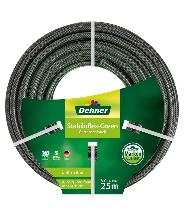 In Ihrem Garten fängt Bio schon beim Gerät an? Dann gibt es für Sie eine ausgezeichnete Nachricht! Der Dehner Gartenschlauch Stabiloflex verzichtet nämlich vollständig auf schadstoffhaltiges Material wie Cadmium oder Phthalat. So schenken Sie Ihren Lieblingspflanzen Wasser in Reinkultur. Dabei passt der Dehner Gartenschlauch Stabiloflex perfekt auf alle gängigen Schlauchwagen und -träger. Und wenn es draußen mal gefriert oder hitzig wird: zwischen -10° C und +60° C hält er das locker aus. Wasser aus dem Dehner Gartenschlauch Stabiloflex – je eher Sie ihn bestellen, desto mehr werden Ihre Pflanzen Sie lieben!