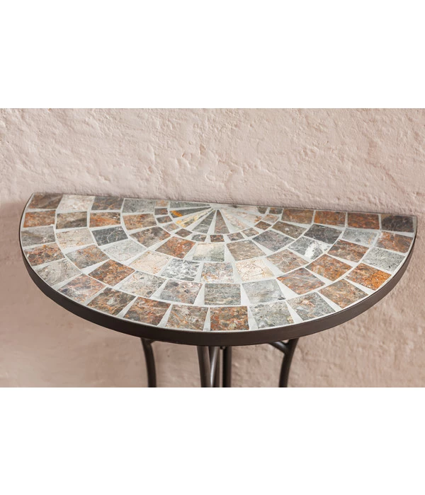 Wünschen Sie sich nicht auch manchmal Ihre Ferien in südländischen Gefilden zurück? Mit dem halbrunden Dehner Mosaiktisch Grazia holen Sie sich das perfekte Urlaubsfeeling auf Ihre Terrasse, den Balkon oder in den Garten. Die mediterrane Optik mit den zauberhaften Mosaiken aus Steinfliesen auf der Tischplatte wird Sie und Ihre Gäste begeistern und macht ihn zu einem echten Hingucker. Aufgrund seiner Form können Sie den Tisch hervorragend an einer Wand platzieren und mit Deko-Objekten ausstaffieren oder beliebig als Ablagefläche oder anderweitig verwenden. Sie werden dieses entzückende Tischchen schnell in Ihr Herz schließen und nie mehr abgeben wollen.