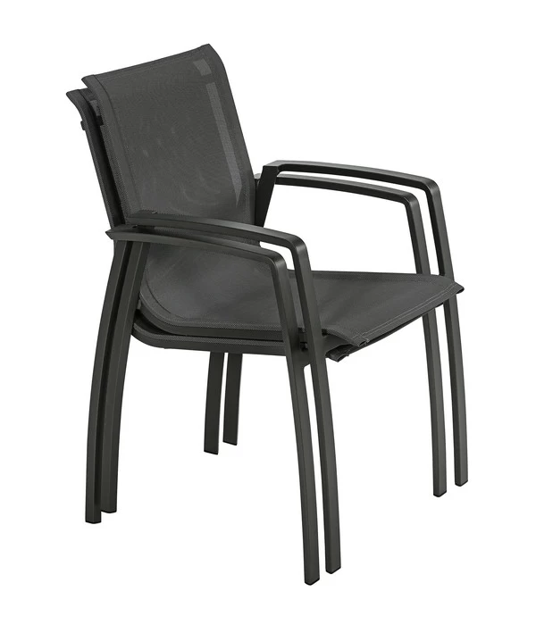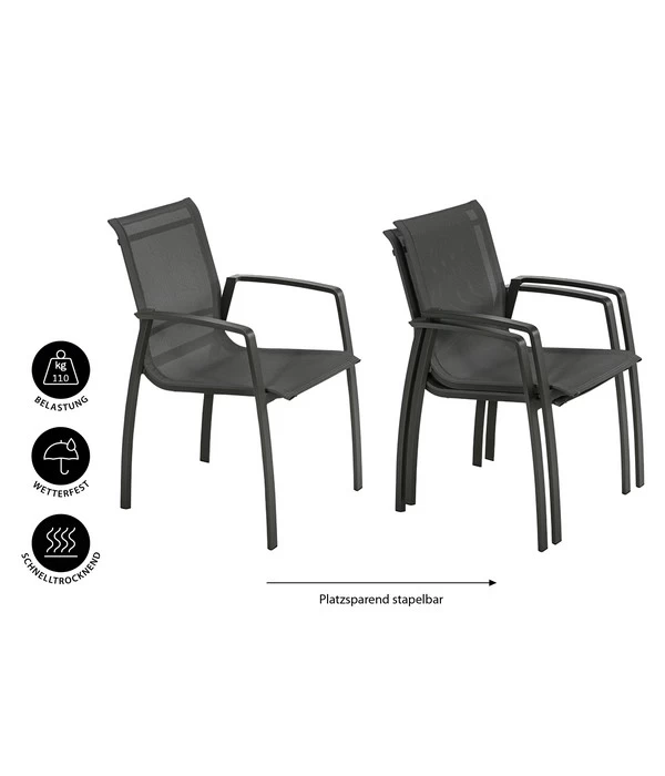 Mit dem Dehner Stapelstuhl Nancy wird der Sommer für Sie noch ein bisschen schöner, denn er verwöhnt Sie nicht nur mit seiner eleganten Optik, sondern auch mit bestem Sitzkomfort. Dafür ist in erster Linie das moderne Funktionsmaterial Textilene verantwortlich, denn es ist atmungsaktiv, so dass Sie auch an heißen Tagen nicht unangenehm ins Schwitzen kommen. Außerdem ist Textilene absolut wetterfest, wasserabweisend und nach einem Regenguss schnell wieder trocken. Und trotz der ausgezeichneten Strapazierfähigkeit beider Materialqualitäten ist der Dehner Stapelstuhl Nancy wunderbar leicht: Er wiegt nur 5,4 kg, so dass Sie ihn ohne große Mühe locker übereinander stapeln können, wenn er nicht gebraucht wird.