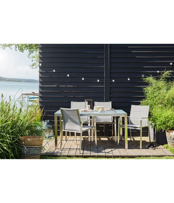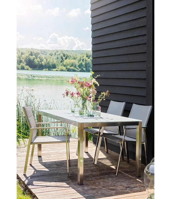 Welcher seiner vielen Vorzüge Ihre Aufmerksamkeit zuerst erregt hat, ist eigentlich unerheblich. Denn der Dehner Stapelstuhl Nantes Elegance wartet nur mit besonderen Vorzügen auf! Schon sein stabiles Gestell aus Edelstahl ist eine Besonderheit, das mit seinen akkurat gefertigten, matt glänzenden Streben begeistert. Seine besondere Design-Note erhält es durch die einzige Rundung vorne an den Armlehnen, die dem hochwertigen Dehner Stapelstuhl Nantes Elegance seine einladende Ausstrahlung verleihen. Perfekt dazu passend nimmt sich die Polsterung in Sitz und Rücken aus, die sich mit ihren Steppungen perfekt in die reduzierte Formensprache einfügt und das edle Terrassenmöbel zu einem perfekten Ganzen werden lässt. Und obgleich der Dehner Stapelstuhl Nantes Elegance eine einzigartige „Persönlichkeit“ hat, ist er dennoch so schlicht und dezent, dass er sich zu den verschiedensten Terrassenmöblierungen kombinieren lässt. Der Dehner Stapelstuhl Nantes Elegance ist die perfekte Bereicherung für Ihre Terrasse – gönnen Sie sich das!