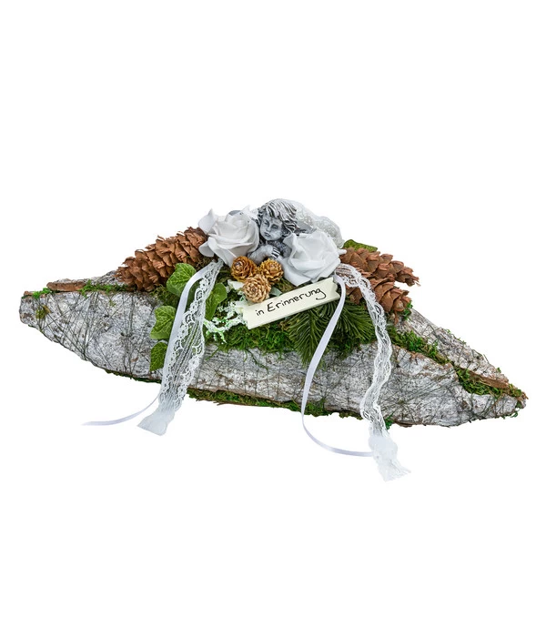Vielleicht wissen Sie, dass das Schiff ein Symbol für die Reise in die Unendlichkeit darstellt. Umso bedeutsamer ist es, dass das ovale Grabgesteck aus Rinde die Form eines Schiffs aufgreift und so eine tröstliche Botschaft vermittelt. Dank der künstlichen Elemente, darunter Tannenzweige, Blätter und Seidenrosen, erfreut das Gesteck lange mit einer ansprechenden Optik. Sie können Feiertage, wie Allerheiligen oder Allerseelen zum Anlass nehmen, um die Begräbnisstätte Ihres Verstorbenen aufzusuchen. Senden Sie mit dem sorgfältig zusammengestellten Grabgesteck aus Rinde einen Gruß ins Jenseits – sichern Sie sich am besten gleich ein Exemplar.