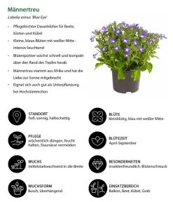 Männertreu, auch Lobelie genannt, gehört nicht ohne Grund zu den beliebtesten Garten- und Balkonpflanzen. Denn erstens beglückt sie uns mit einer Fülle intensiv leuchtender Blüten und zweitens ist diese Blütenpracht nicht nach kurzer Zeit vorbei, sondern hält bis in den September mit unverminderter Intensität an. Das muss eine andere blaue Sommerblume der Lobelie erst einmal nachmachen! Ein echtes Highlight in unserem Sortiment ist die Lobelie ‚Blue Eye‘. Denn diese Sorte blüht nicht nur besonders früh, sondern auch in . Von weitem zwinkern die blauen Blüten mit ihrem weißen Auge einem zu. Blüten so unzählig und farbintensiv, dass man sich wie auf Wolken fühlt.