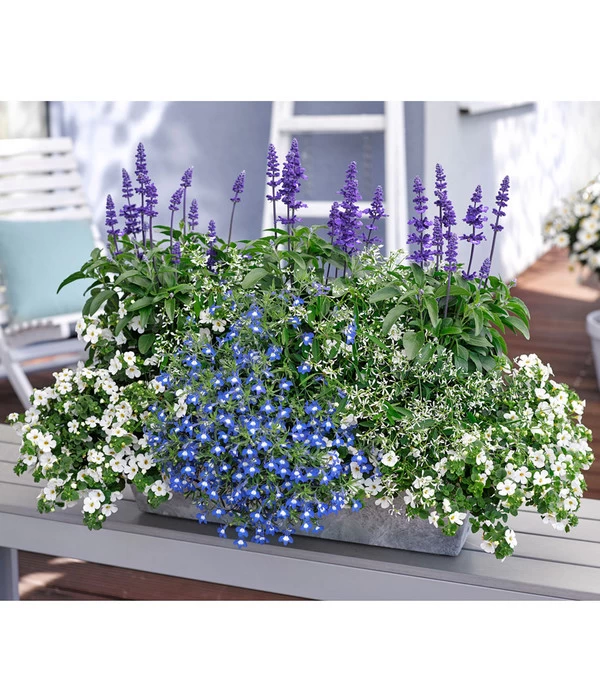 Lust auf ein Kombitalent? Dann sind sie mit der Lobelie ‚Blue Eye‘ fündig geworden. Denn ob in kleine oder große Kübel, in Ampeln oder Kästen. Das dichte Blütenpolster der Lobelie wächst schnell und kompakt über den Rand des Blumenkastens oder des Topfes herab. Deshalb eignet sich Männertreu auch wunderbar als Unterpflanzung bei Hochstämmchen. Mit dieser Pflanze in Balkonkästen, Töpfen oder Ihren Beeten wird der Sommer immer himmelblau für Sie werden, auch wenn mal graue Wolken am Himmel stehen!