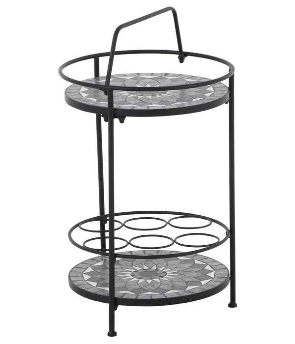 Eine gekonnte Verbindung von praktischer Funktion und kunstvoller Gestaltung – nur wenige Gegenstände können beides in sich vereinen. Der Siena Garden Mosaikbeistelltisch Como ist ein Outdoor-Wohnaccessoire mit diesen besonderen Eigenschaften. Der Künstler hat dafür ein fast filigran wirkendes Stahlgestell entworfen, das auf zwei Ebenen Platten präsentiert, die wiederum mit dekorativen Fliesenmosaiken belegt sind und der schlichten, eher geradlinigen Optik des Gestells einen mediterranen Charakter einhauchen. Im Stahlgestell wiederum stecken verschiedene Funktionen. Sei es der praktische Griff, an dem sich das Tischchen kinderleicht von A nach B mitnehmen lässt, sei es die Reling an der oberen Tischplatte, die Gläser und Schälchen beim Tragen davor schützt beim Tragen abzurutschen. Oder seien es die 6 Ringe über der unteren Platte, in die sich 6 Flaschen hineinstellen und so ebenfalls problemlos transportieren lassen – als Ihre sommerliche Minibar mit Stil. Sicher sind Sie mit uns einer Meinung: Den Siena Garden Mosaikbeistelltisch Como müssen Sie besitzen!