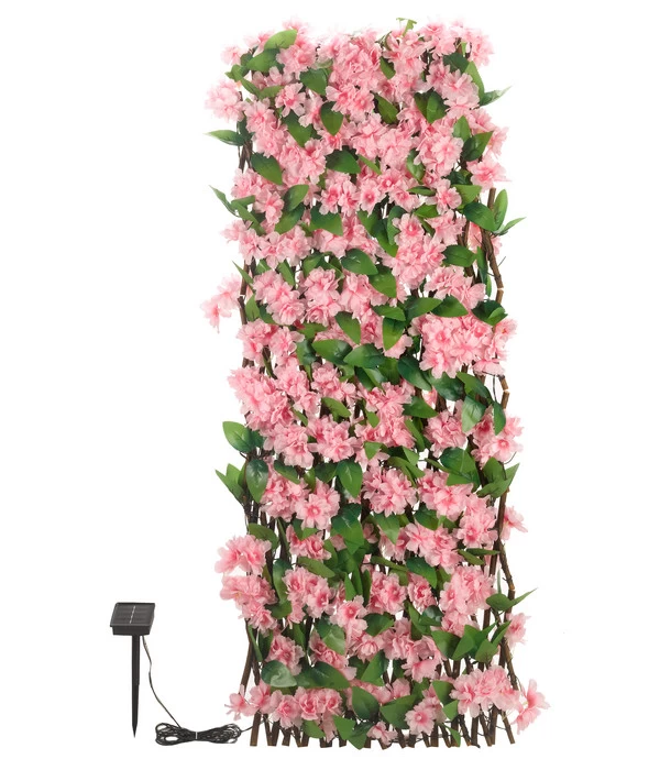 Smart Garden präsentiert Ihnen ein großes Sortiment an Lichtquellen, die für ein gemütliches Ambiente an vielen Orten des Außenbereichs sorgen. Wenn Sie eine ebenso kreative wie wundervoll designte Möglichkeit suchen, Ihr Grundstück zu beleuchten, dann stellt das Solar-Spalier Kirsch eine erstklassige Möglichkeit dar. Sie erhalten ein hochwertiges Produkt aus Weide, das mit Blättern und Kirschrosen aus langlebigem Kunststoff übersäht ist. So vereint Ihr Neuzugang große Robustheit mit einem ansprechenden, natürlich wirkenden Design.