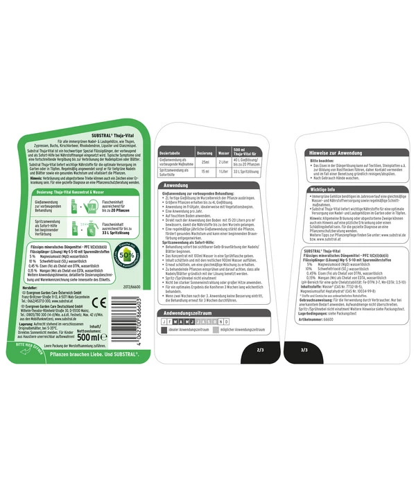 Mit dem Substral Thuja-Vital flüssig erhalten Sie den optimalen Spezialdünger, damit Ihre immergrünen Nadel- und Laubgehölze ihre volle Pracht entfalten können. Eine Besonderheit dieses Flüssigdüngers besteht in seiner hohen und schnellen Wirksamkeit. Wenn etwa Thujen, Zypressen, Rhododendron, Kirschlorbeer, Buchs oder viele andere Arten an einem Nährstoffmangel leiden oder dieser zumindest droht, dann setzen Sie Substral Thuja-Vita zur sofortigen Hilfe oder zur Vorbeugung ein. Er entfaltet seine Wirkung direkt über die Wurzeldüngung und über die Blätter. So wird die Pflanze umfassend mit allem versorgt, was sie benötigt.