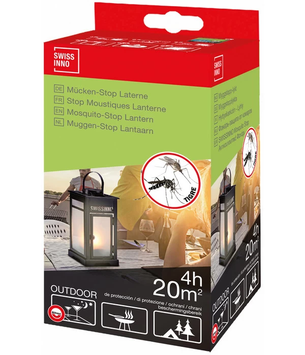 Was gibt es Schöneres, als in einer lauen Sommernacht im Garten oder auf dem Balkon zu sitzen? Wenn nur die Mücken nicht wären! Schutz vor den Plagegeistern bietet die Mückenstop-Laterne für den Außenbereich von Swissinno. Die Kombination Kerze / Laterne / Wirkstoff hält Mücken für rund vier Stunden fern, der Wirkungsbereich beträgt dabei ca. 20 m². Zudem spendet die formschöne Laterne auch noch weiches Kerzenlicht.