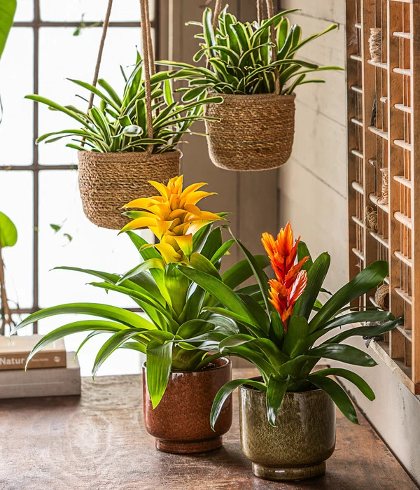 Wenn Sie Ihr Zuhause mit einer attraktiven Zimmerpflanze optisch aufwerten möchten, stellt die schöne Vriesea – Bromelia cultivars ‚Intenso Orange‘ eine tolle Wahl dar. Die dekorative Pflanze bezaubert mit einer charmanten exotischen Ästhetik. Ein leuchtend bunter Blütenstand in Kombination mit rosettenförmigem, saftig grünem Blattwerk sorgt für ein sehr ansprechendes Erscheinungsbild. Bromeliengewächse wie die Vriesea ‚Intenso Orange‘ stammen ursprünglich aus den tropischen Wäldern Mittel- und Südamerikas, wo sie als sogenannte Aufsitzerpflanzen auf Bäumen zu finden sind und über ihre Laubtrichter Wasser sowie Nährstoffe aufnehmen.