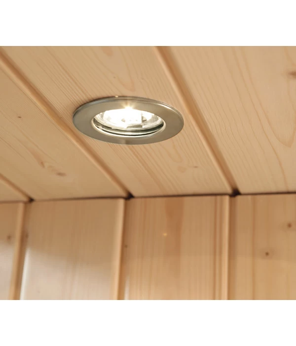 Die Weka Infrarotkabine Osby besteht aus vorgefertigten Wand- und Deckenelementen, die einen einfachen und schnellen Aufbau ermöglichen. In die Elemente sind die Flächenstrahler bereits steckerfertig eingebaut. Innen sind die Wände rundum mit 14 mm naturbelassenen Softline Nut- und Federbrettern aus Fichte verkleidet. Auch die Fensterelemente und die exklusive Glastür aus Sicherheitsglas sind im Lieferumfang inbegriffen. Noch ein Vorteil: Die Wärmekabine braucht nur einen haushaltsüblichen 230-Volt-Anschluss, Sie brauchen also keinen extra Starkstromanschluss zu organisieren.
