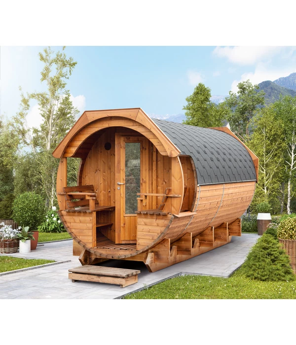 Stellen Sie sich vor, wie Ihre Nachbarn staunen werden, wenn bei Ihnen ein LKW vorfährt und wenig später das Wolff Finnhaus Saunafass Premium Svenja 2 montiert Thermoholz auf der stabilen Unterkonstruktion im Garten steht! Aber auch für Sie selbst wird es immer ein besonderes Erlebnis sein, Ihre neue Fasssauna im Garten zu sehen, sie zu betreten und sich dort dem Vergnügen des gesunden Schwitzens hinzugeben. Und danach ruhen Sie sich noch ein Weilchen wohlig entspannt auf den Bänken auf dem überdachten Vorraum aus und genießen die frische Luft im Garten. Schöner als in jeder anderen Sauna! Und dank der kompakten Bauweise braucht das Wolff Finnhaus Saunafass Premium Svenja 2 montiert Thermoholz auch nur wenig Platz im Garten. Bestellen Sie gleich dieses tolle Saunafass und schon bald wird der LKW bei Ihnen vorfahren und Ihr Garten um ein Highlight reicher sein.