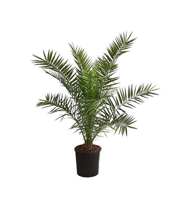Die ursprünglich aus Vorderasien stammenden Phönix-Palmen haben sich über Indien und Nordafrika im Laufe der Zeit auch in den tropischen und subtropischen Gebieten Afrikas, auf den Mittelmeerinseln und den Azoren ausgebreitet. Die XXL Kanarische Dattelpalme, die wir Ihnen hier in der Größe von bereits 140-160 cm anbieten, hat ihre Heimat tatsächlich auf den Kanarischen Inseln, wird aber weltweit als prachtvolle Kübelpflanze geschätzt. Haben auch Sie Lust, ein wenig entspannte Urlaubs-Atmosphäre auf Ihrer Terrasse oder im Garten zu genießen? Dann lassen Sie bald diese dekorative Phönix-Palme bei Ihnen einziehen und ihre eindrucksvolle Krone mit den langen Wedeln zur Schau zu stellen. Die XXL Kanarische Dattelpalme wird zwar im Kübel weder eine Höhe von 20 m erreichen wie am Naturstandort, aber ihre sattgrünen Wedel sind trotzdem immer ein eindrucksvoller Blickfang.