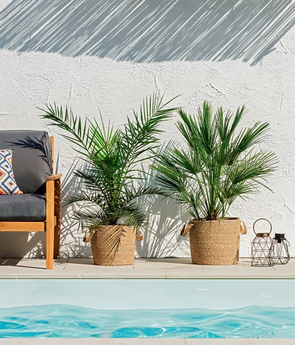 Vielleicht geht es Ihnen so wie vielen anderen: Beginnt die XXL Kanarische Dattelpalme ihr exotisches Flair zu verbreiten, wächst die Lust auf noch mehr Urlaubs-Feeling. Eine Lust, die wir stillen können, denn wir haben noch andere beeindruckende Outdoor-Palmen im Angebot. Da sind zum Beispiel die stattlichen Hanfpalmen oder die dekorativen Zwergpalmen, die gerne zusammen mit der Kanarischen Phönix-Palme Ihren Outdoor-Bereich in ein exotisches Urlaubsparadies verwandeln.